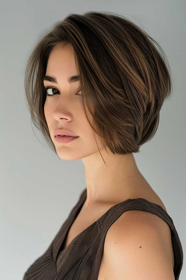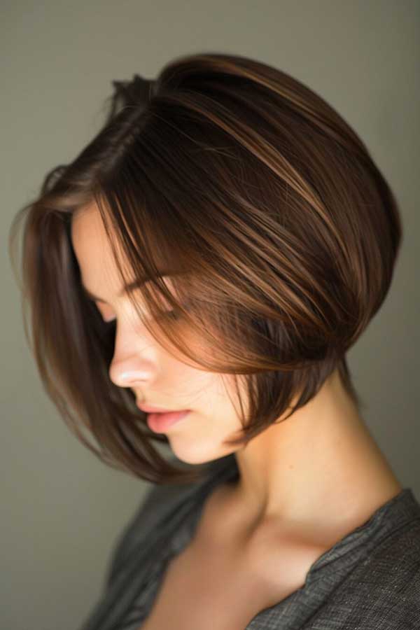 Short stacked bob with highlights is a stylish and dynamic hairstyle that adds volume and dimension. The stacked layers at the back create a lifted, fuller look, while highlights enhance depth and texture. This chic cut flatters various face shapes and works well with both sleek and tousled styles. Effortlessly modern and low-maintenance, the short stacked bob with highlights offers a fresh, sophisticated, and voluminous look perfect for any occasion.