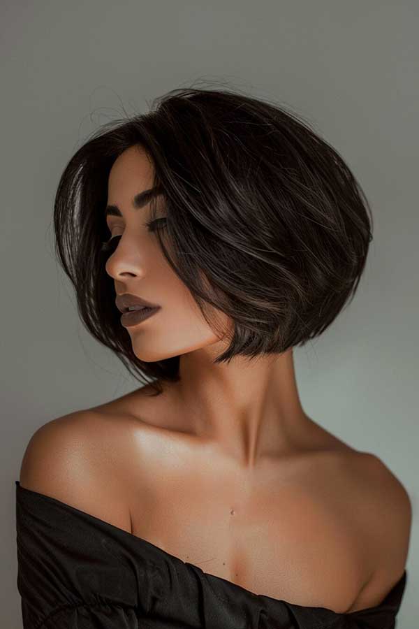 Short stacked bob is a chic and voluminous hairstyle that adds depth and dimension. With shorter layers in the back and longer pieces in the front, this cut creates a lifted, structured shape that enhances fullness. It flatters various face shapes and works well with both sleek and tousled styles. Stylish and low-maintenance, the short stacked bob is perfect for those seeking a modern, sophisticated, and effortlessly polished look.