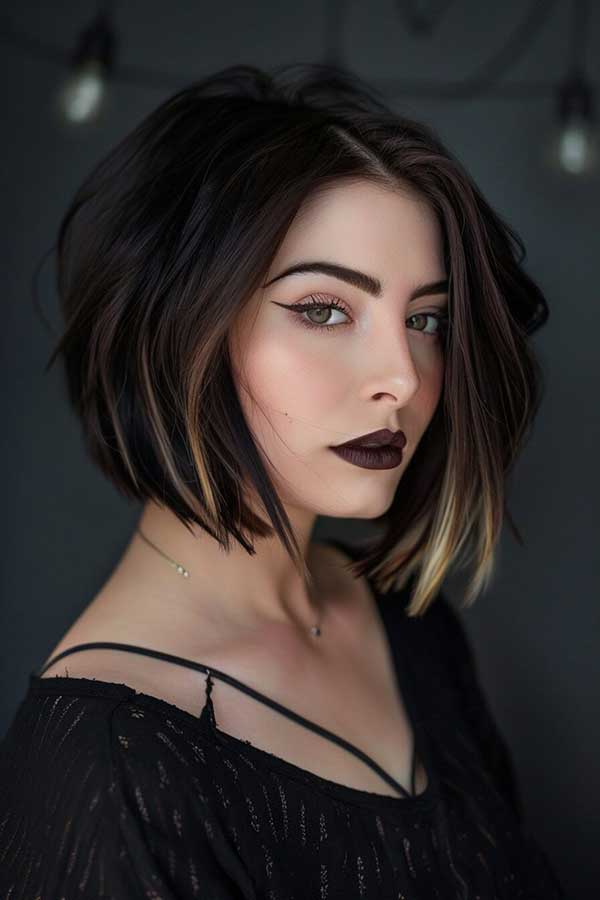 A sleek angled bob with highlights is a sophisticated and modern hairstyle that enhances dimension and structure. The angled cut, shorter at the back and longer in the front, creates a sharp, polished look, while highlights add depth and brightness. This versatile style flatters various face shapes and works well with straight, glossy finishes. Chic and low-maintenance, the sleek angled bob with highlights exudes elegance and confidence for any occasion.