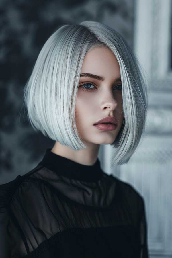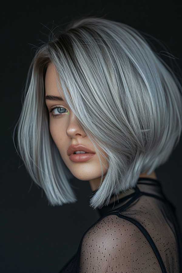 Straight silver bob is a sleek hairstyle that exudes modern elegance. The cool-toned silver hue adds a bold, futuristic touch, while the straight cut enhances shine and smoothness. This chic bob frames the face beautifully, creating a polished and refined look.