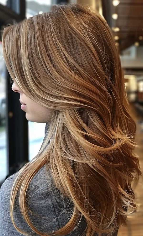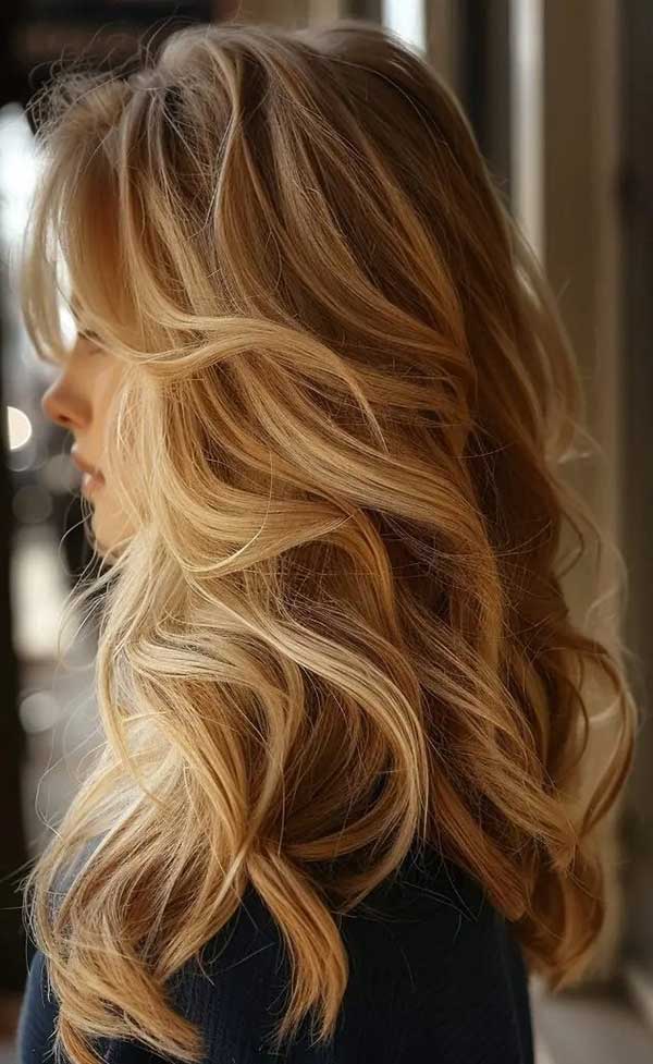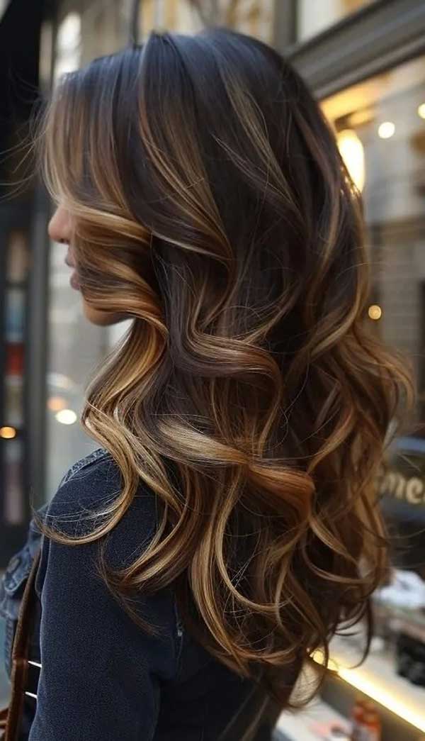 Toffee balayage features warm, caramel and honey highlights blended into a darker base, creating a rich, dimensional look. The toffee tones add depth and warmth, enhancing the hair’s texture and movement. This technique transitions softly from dark roots to lighter, golden ends, giving a natural, sun-kissed effect.