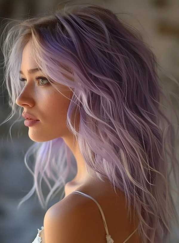 Lavender balayage on blonde hair combines soft lavender highlights with light blonde strands, creating a dreamy, ethereal effect. The pastel purple tones seamlessly blend into the blonde base, adding a pop of color while maintaining a natural, sun-kissed look.