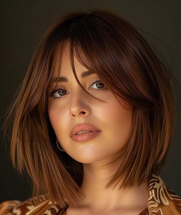 Lob haircut with bangs pairs the classic long bob with stylish bangs for added personality and framing. Whether blunt, side-swept, or wispy, bangs enhance facial features and add depth. This versatile look works well with all hair types and face shapes, creating a fresh, modern vibe that’s both chic and playful for any occasion.