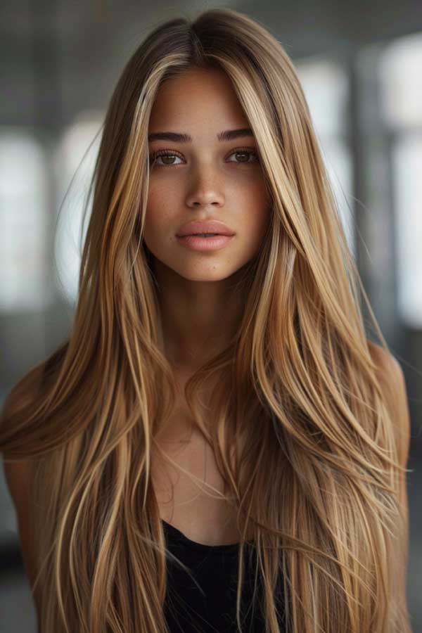 Long straight hair with honey blonde highlights delivers a warm sun-kissed glow that’s effortlessly elegant. The honey tones add depth and brightness, enhancing the hair’s natural shine. Perfect for adding dimension to straight strands, these highlights blend seamlessly for a soft natural look.