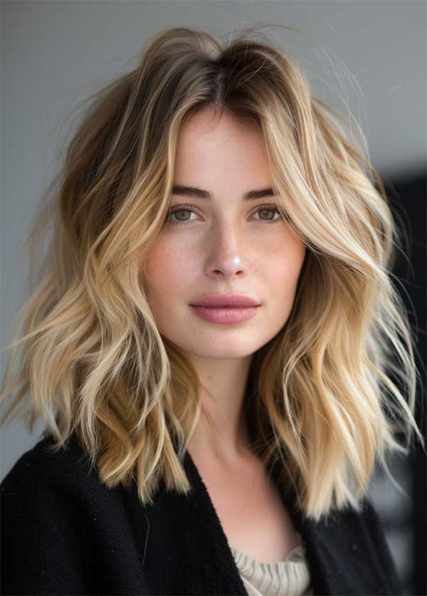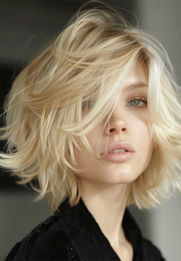 A sandy blonde tousled bob are neutral blonde tones add a soft sun-kissed glow, while the tousled texture gives the cut effortless volume and movement. Perfect for those who love a low-maintenance and stylish look. It’s a versatile hairstyle that’s easy to style and always on-trend for a relaxed and chic finish.