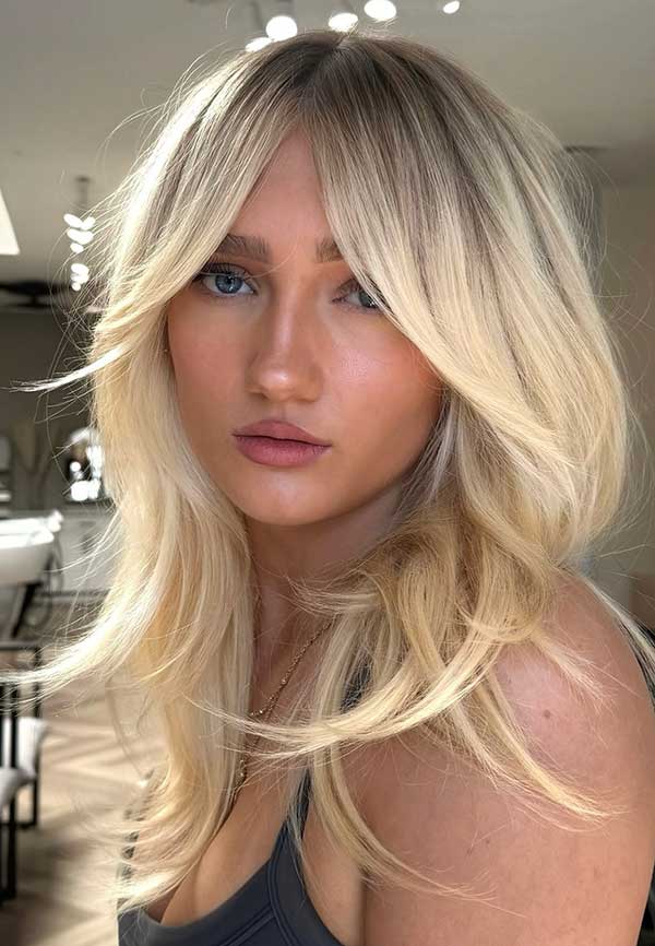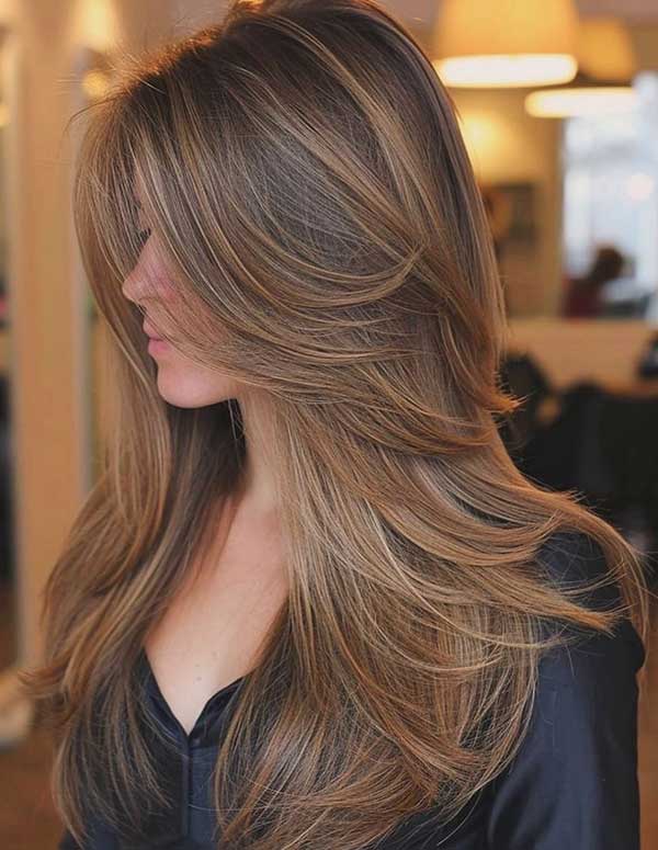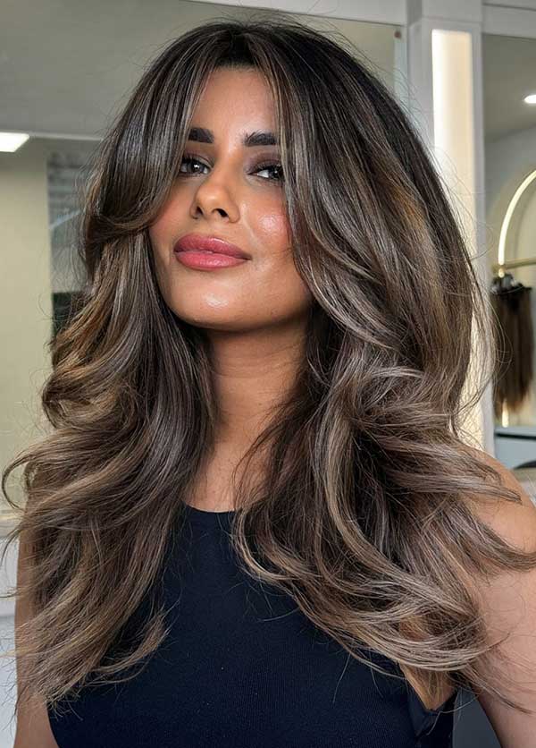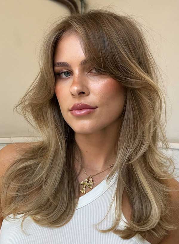 Textured long layers with soft bangs create a flowing stylish look full of movement and shape. The long layers add volume and dimension, while the soft bangs gently frame the face for a feminine touch. It’s a great choice for anyone seeking a low-maintenance hairstyle with subtle charm.