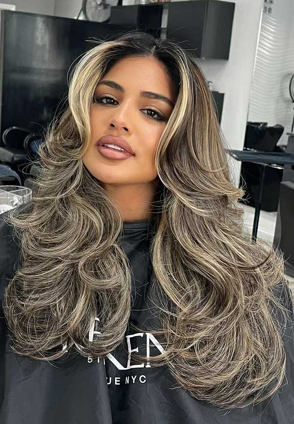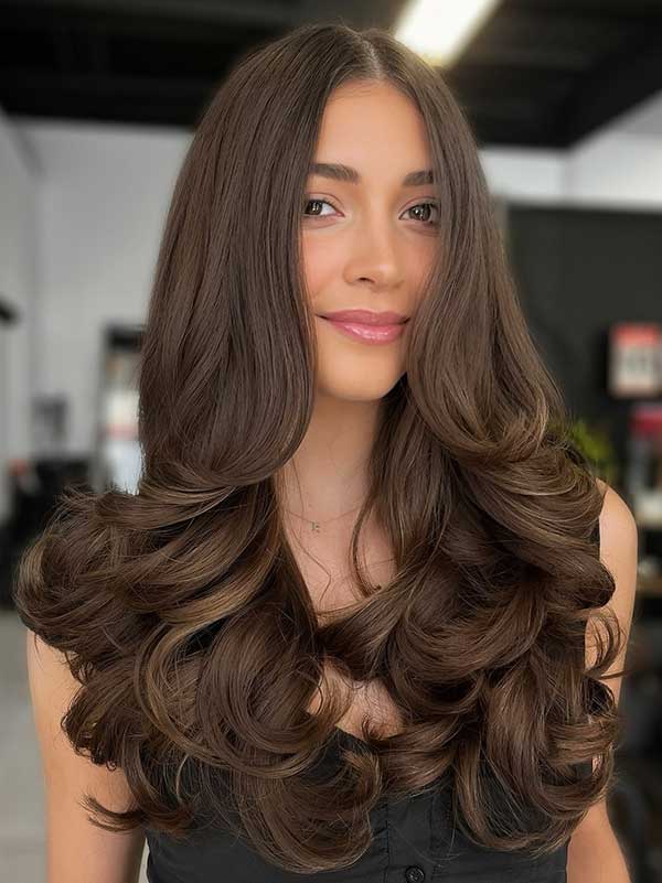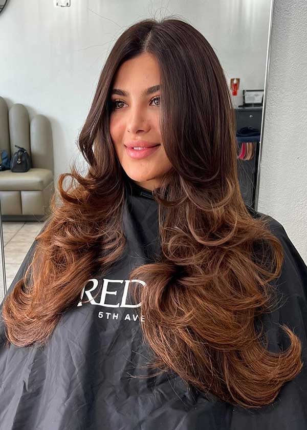 The layered cut adds bounce and flow, while the soft waves enhance texture and volume. The rich brown tone brings depth and shine while highlighting each layer beautifully. This look is effortlessly stylish and flattering which offers a relaxed vibe that works for both everyday wear and special occasions.