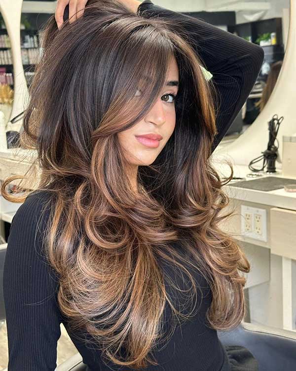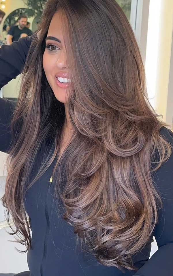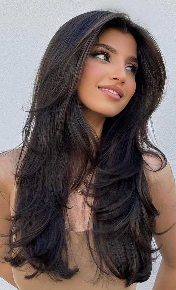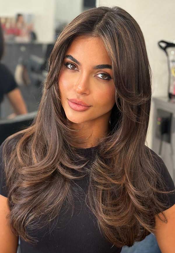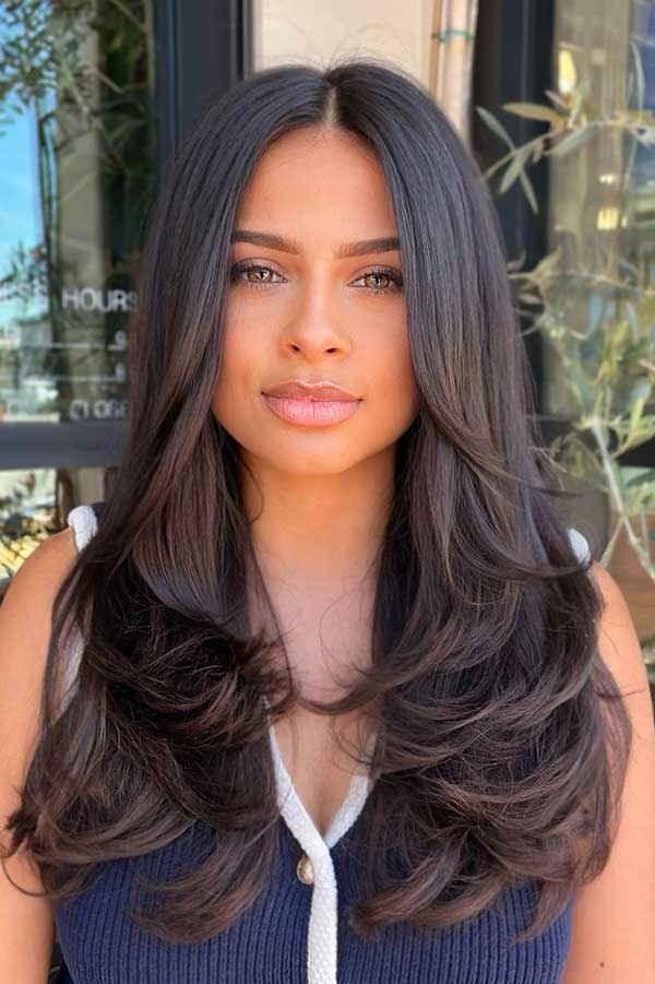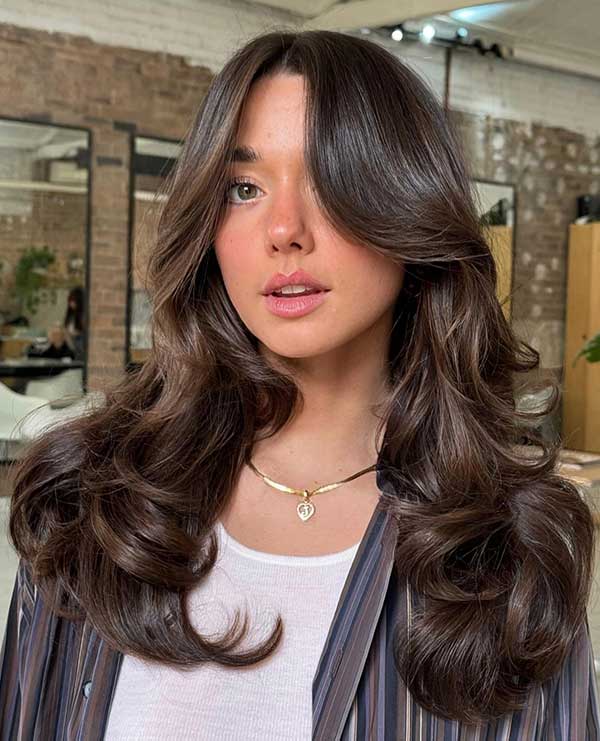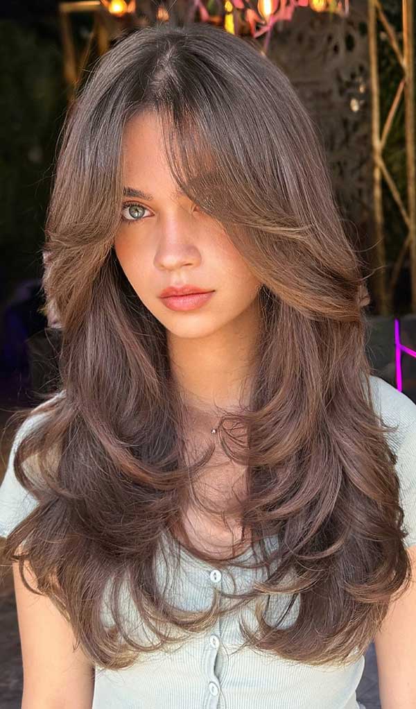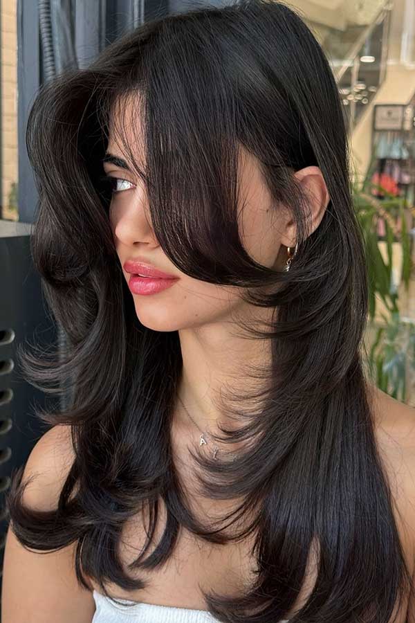 The soft layers create a fluttery effect which adds volume and movement throughout the hair. Curtain bangs gently frame the face, enhancing natural features with a relaxed face-softening touch. The deep brunette tone adds depth and shine, making this look ideal for medium to long hair.