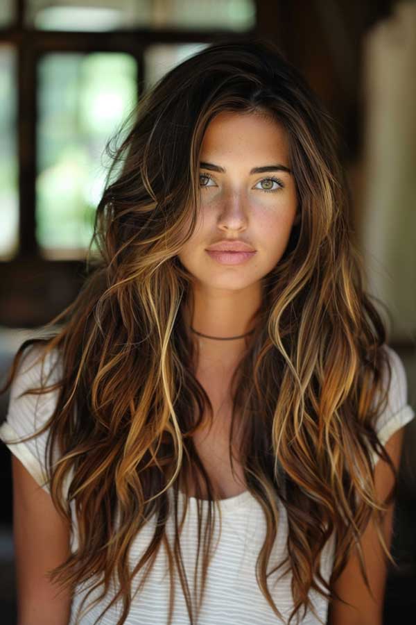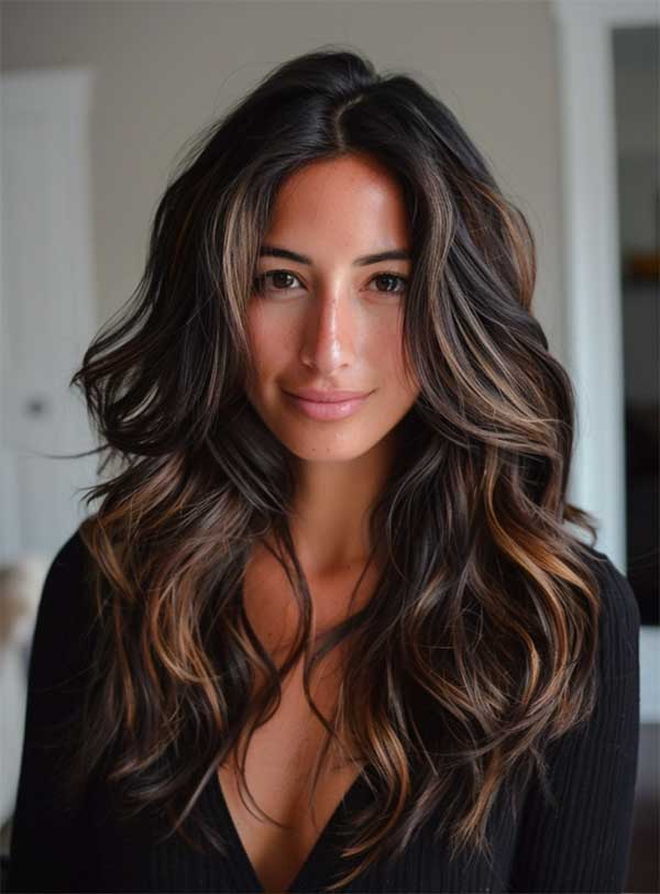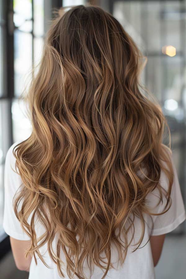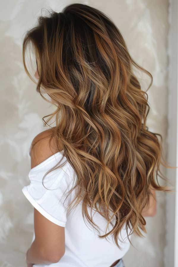 Long wavy hair with caramel balayage highlights creates a soft, sun-kissed look that’s effortlessly chic. The warm caramel tones add depth and dimension, beautifully enhancing the natural waves. This style blends seamlessly, giving hair a luminous, beachy vibe while remaining low-maintenance.