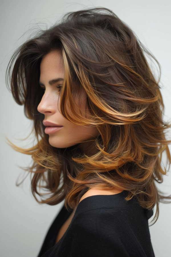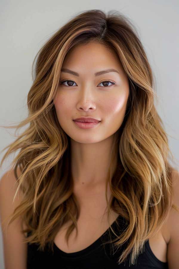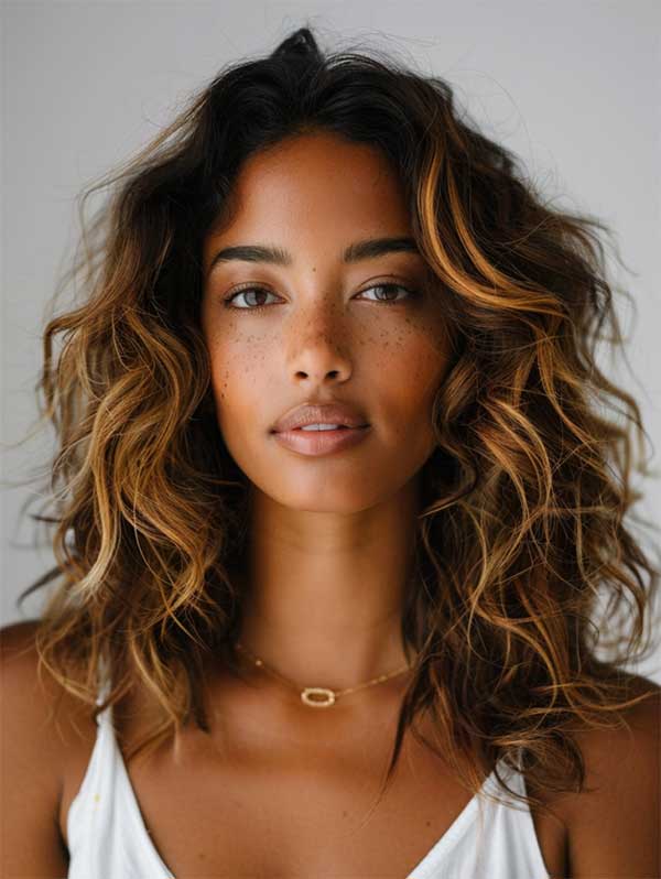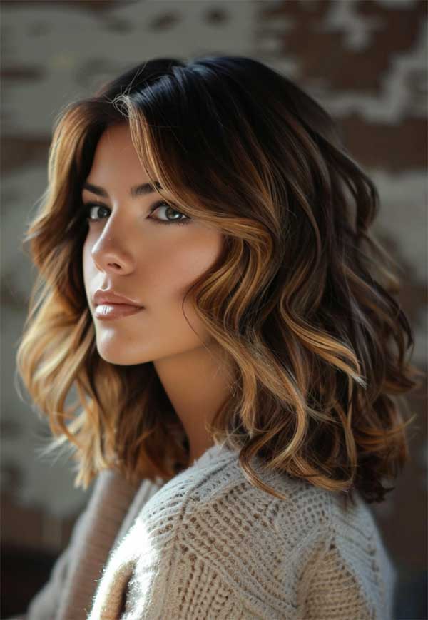 Medium-length wavy hair with caramel balayage highlights offers a perfect blend of texture and warmth. The soft caramel tones are delicately painted onto the waves, enhancing their natural movement and adding a radiant, sun-kissed glow. Caramel balayage on medium waves brings a touch of brightness while remaining low-maintenance and versatile.