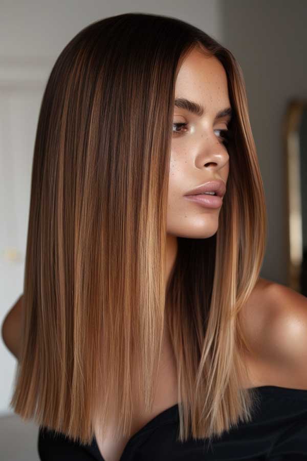 Caramel balayage on straight hair with blunt ends creates a sleek modern look that balances warmth with precision. The soft caramel tones subtly lighten the hair, adding depth and a sun-kissed glow that contrasts beautifully with the sharp, clean-cut edges of the blunt style.