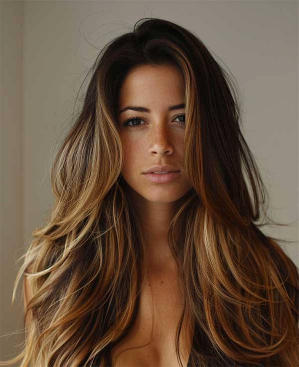 Long layered hair with caramel balayage is a rich caramel tones blend seamlessly through the layers, highlighting the hair’s natural movement and creating a soft radiant effect. Caramel balayage is perfect for adding depth and glow to layered hairstyles with its natural grow-out and low-maintenance upkeep.