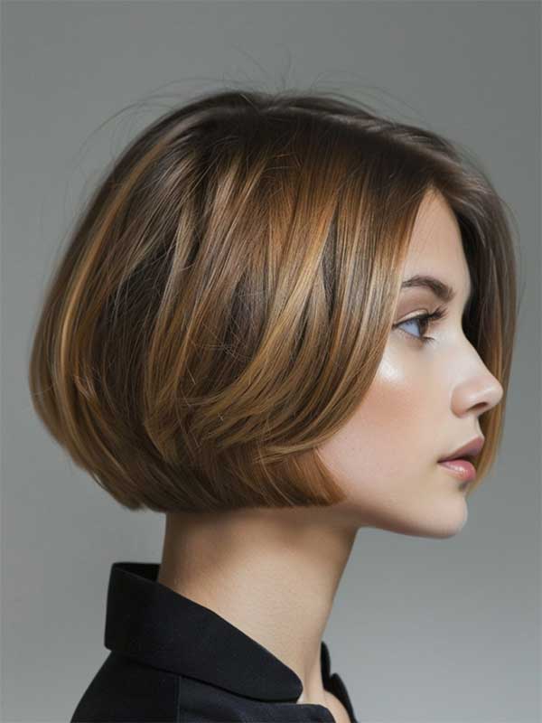 A short bob with caramel balayage is a trendy hairstyle that adds warmth and dimension to a classic cut. It create a soft sun-kissed effect that brightens the face and adds texture to the sleek bob. This look enhances natural movement and gives a modern twist to short hair, while the balayage technique ensures a low-maintenance grow-out.