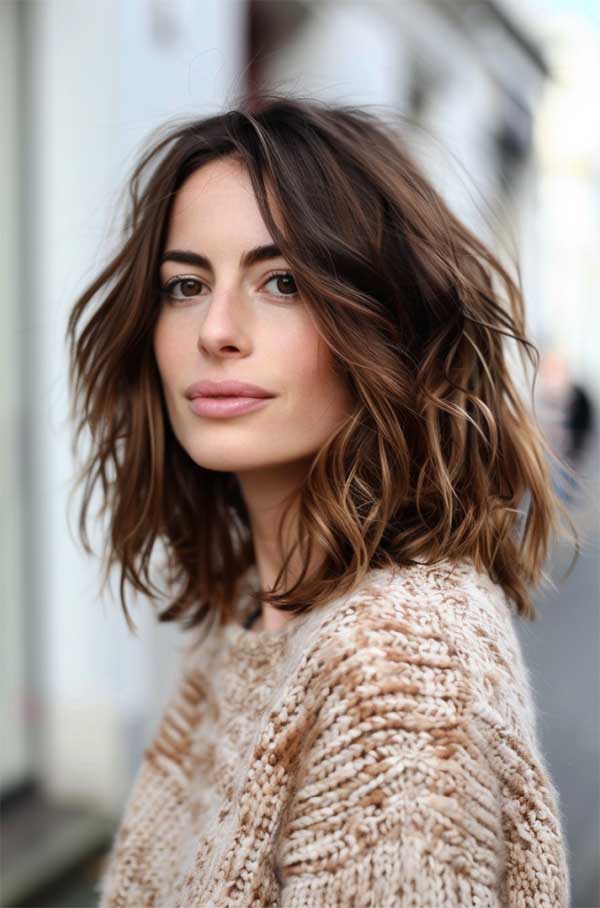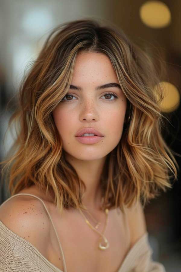 A wavy lob with caramel balayage highlights offers a trendy and effortless style that combines soft texture with warm tones. This look is both fresh and versatile, flattering many face shapes and skin tones. The color grows out subtly, making it a low-maintenance yet polished choice for everyday wear.
