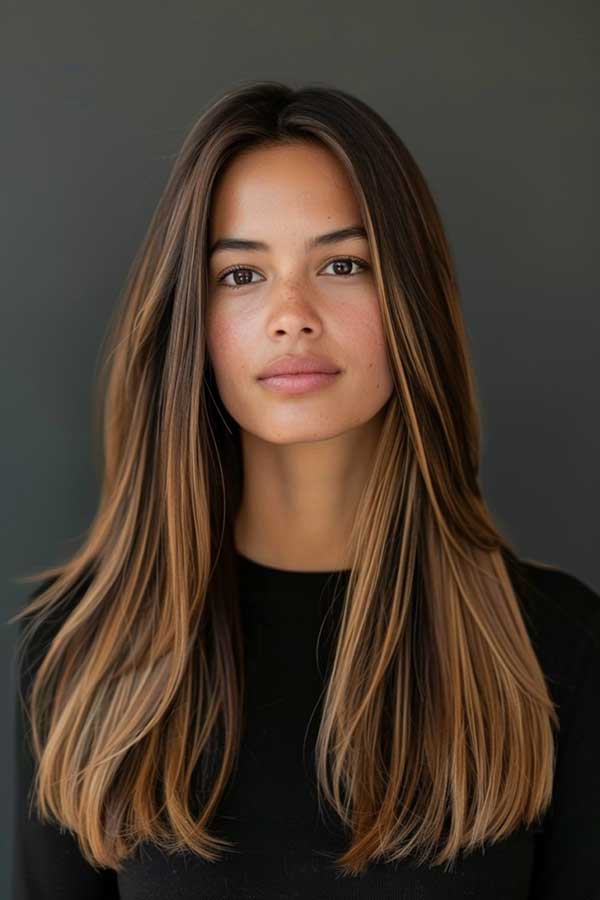 Straight hair with subtle caramel balayage offers a sleek polished look with a touch of warmth and dimension. The soft caramel tones gently melt into the natural base color, creating a refined, sun-kissed effect without harsh contrasts. This style enhances shine and smoothness while adding visual interest to straight strands.