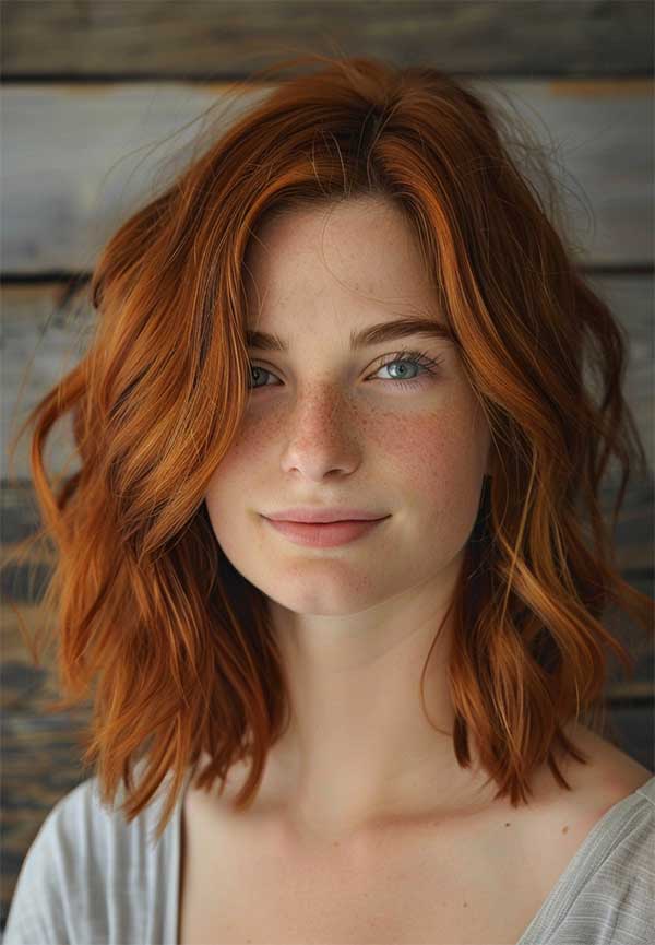 A beachy copper lob is a trendy hairstyle that blends warm copper tones with effortless texture. Loose and tousled waves give it a laid-back, sun-kissed vibe which is perfect for a casual yet polished look. This style enhances the copper’s natural warmth and shine, making it a vibrant choice for those wanting a modern beach-inspired hairstyle.