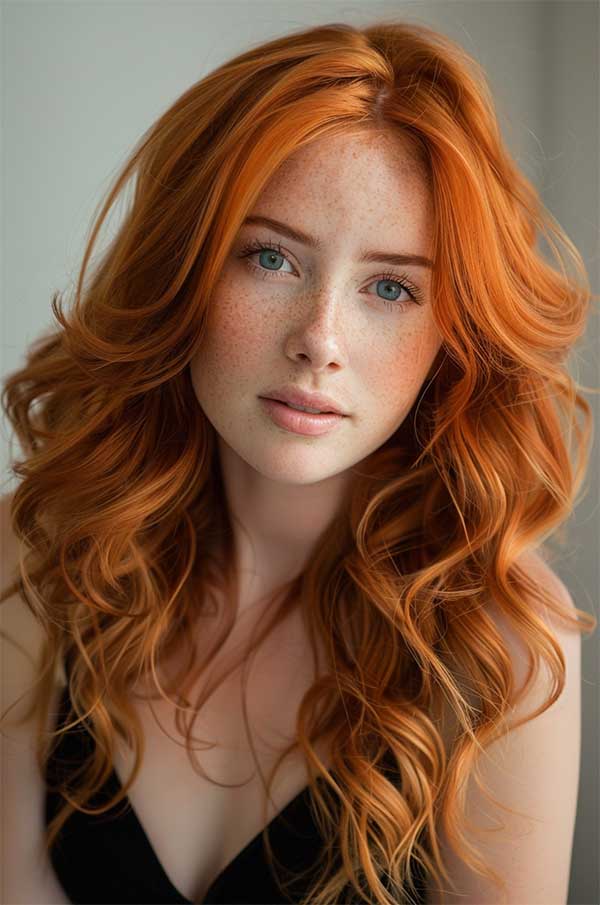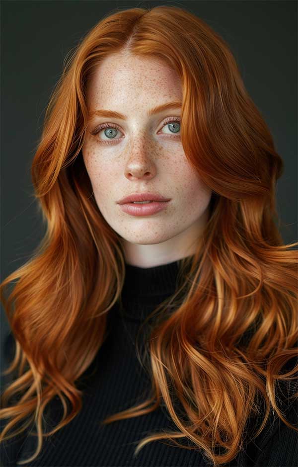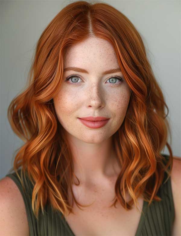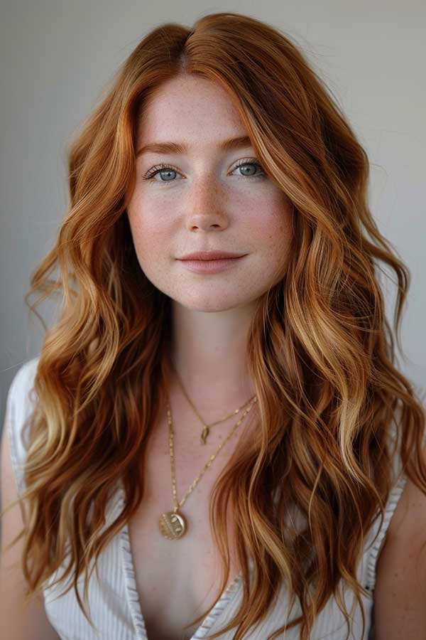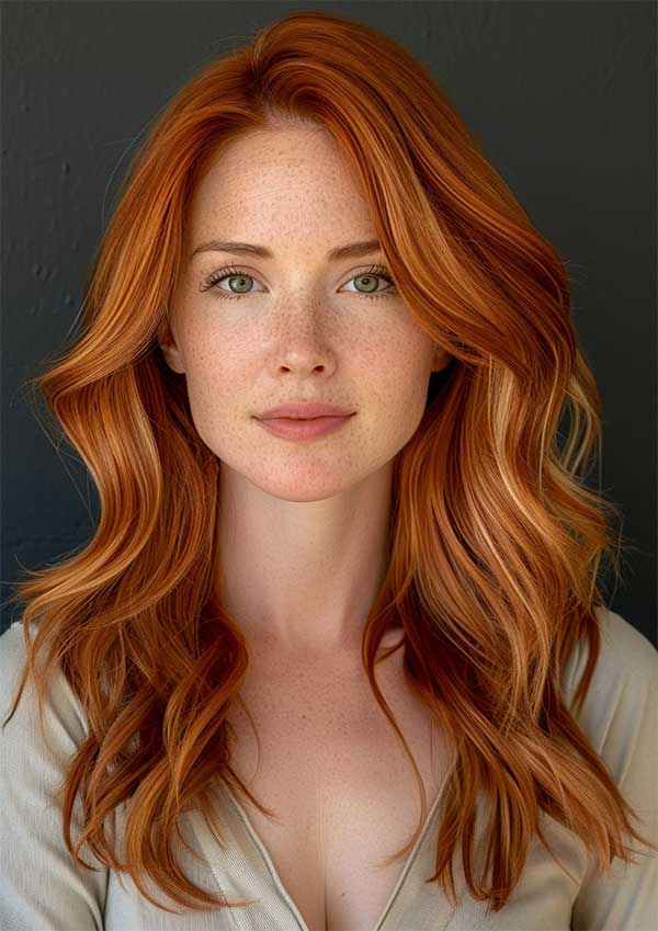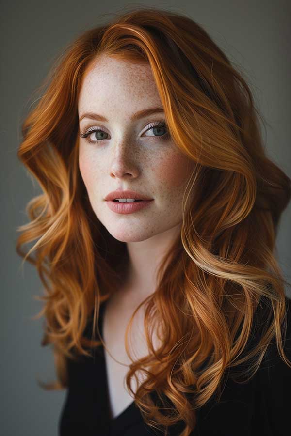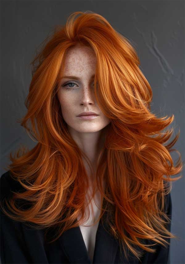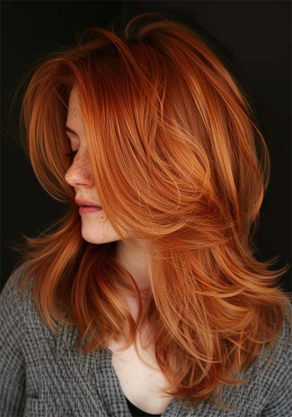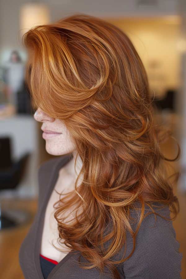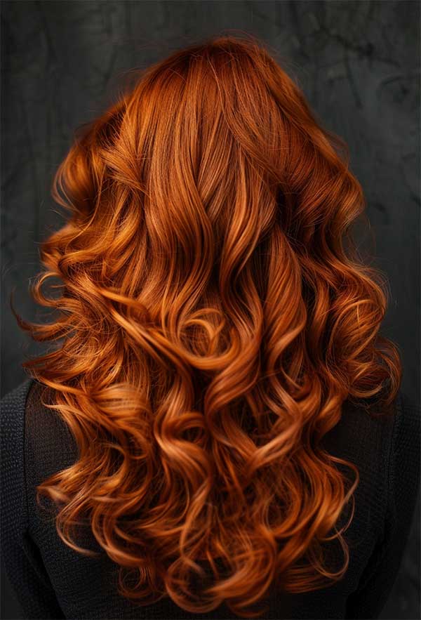 Layered copper waves combine rich, warm copper tones with textured layers for a voluminous hairstyle. The layers add movement and depth, allowing the waves to flow naturally and catch the light beautifully. This style enhances the vibrancy of the copper color with creating a radiant and multidimensional look.