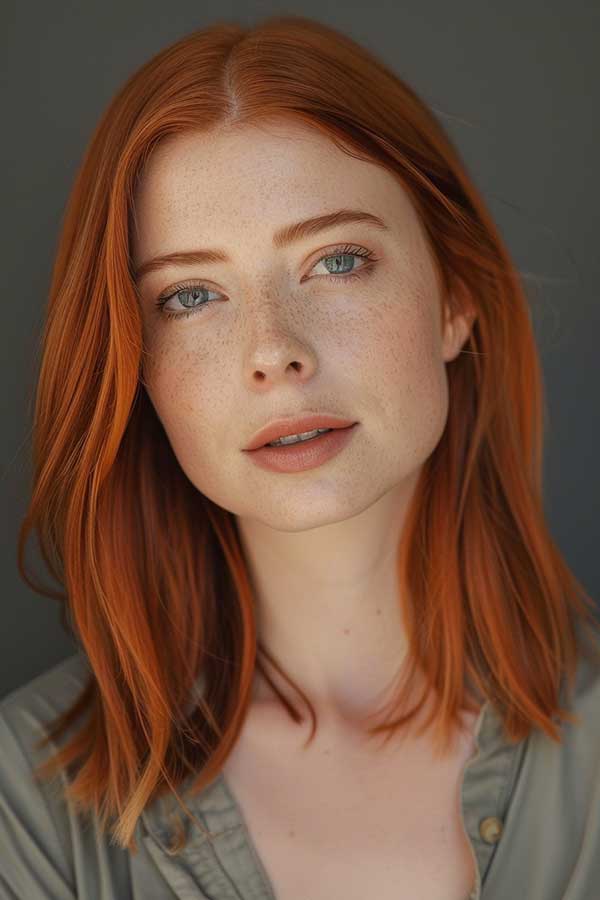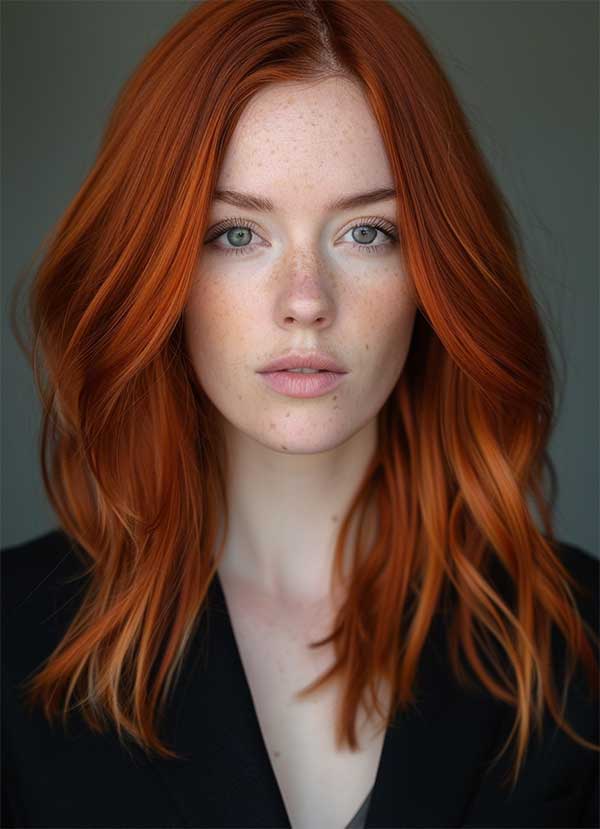 Copper hair with a middle part offers a sleek and modern take on this bold hue. The rich warm tones of copper frame the face evenly, creating a balanced and symmetrical look that highlights facial features. Ideal for those who love a minimalist aesthetic with a vibrant twist.