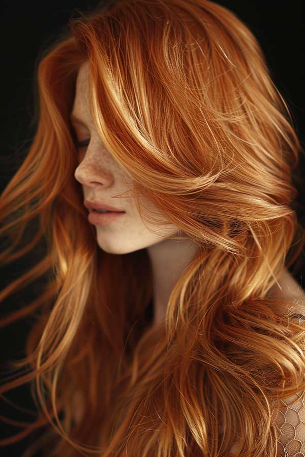 Deep copper hair with caramel lowlights creates a rich, multidimensional look full of warmth and depth. The intense copper base shines brightly, while the caramel lowlights add subtle contrast and softness, enhancing texture and volume. This combination is perfect for adding complexity to straight or wavy hair, making it look fuller and more dynamic.