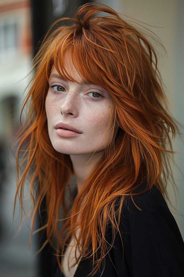 A medium-length copper shag is a trendy and textured hairstyle that combines bold color with effortless edge. The vibrant copper shade adds warmth and brightness, while the shag cut brings layers and movement for a tousled, lived-in look. It’s a playful and modern choice that balances boldness with easy maintenance.