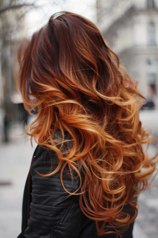Copper and caramel balayage waves blend warm, sun-kissed tones for a soft dimensional look. The copper adds a fiery base, while caramel highlights create natural-looking contrast and movement. This balayage technique enhances texture and gives a lived-in radiant finish. It’s a flattering choice for many skin tones and a low-maintenance way to add warmth and brightness without constant touch-ups.