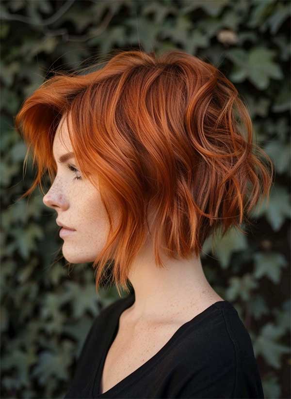 An asymmetrical copper bob is a striking hairstyle featuring bold and vibrant copper tones paired with an uneven cut that’s longer on one side. This edgy style adds dimension and movement, making the copper color pop even more. The asymmetrical copper bob effortlessly blends boldness and elegance in one chic package.