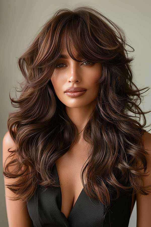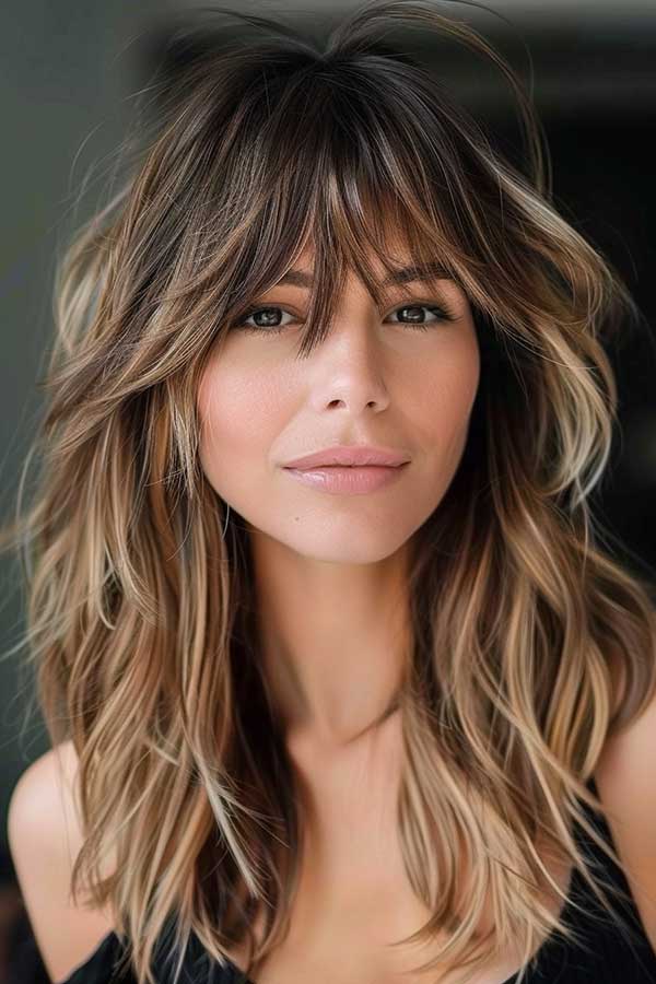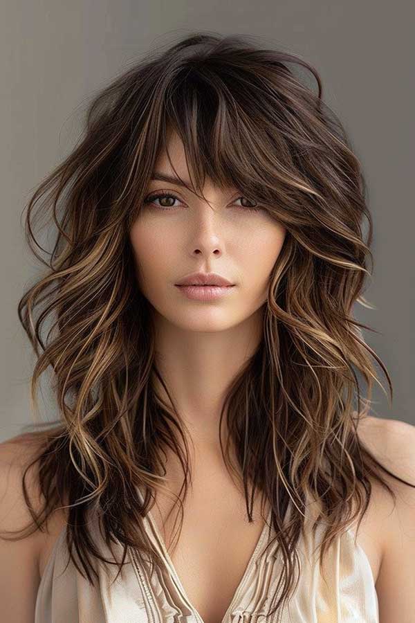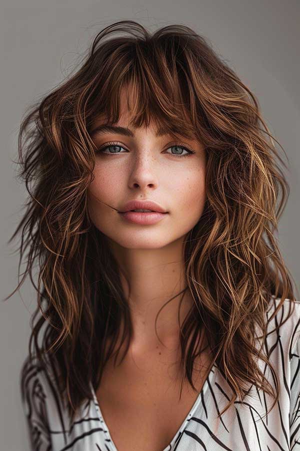 Long shag with bangs combines the edgy texture of a shag haircut with the softness of bangs, creating a balanced, modern style. The layered shag adds volume and movement, while the bangs frame the face for a flattering, youthful look. This versatile cut works well with straight, wavy, or curly hair, offering an effortlessly cool vibe. It’s a low-maintenance, chic style that blends texture, shape, and personality.