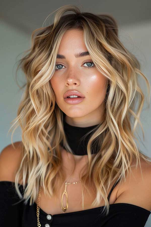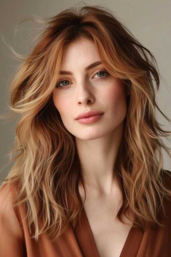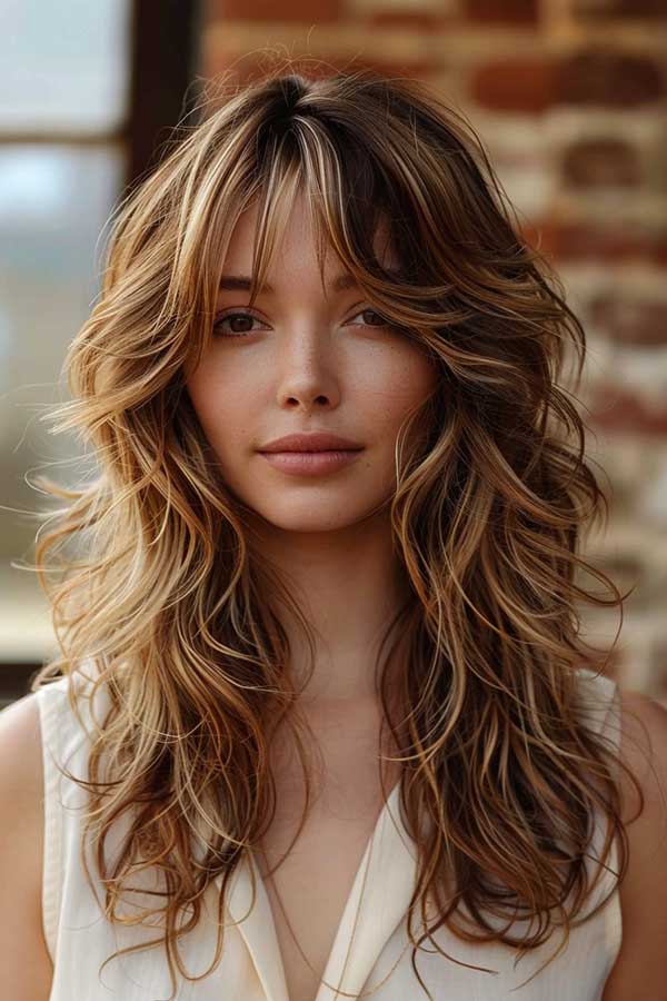 Sunkissed long shag waves combine textured layers with soft, beachy waves for a relaxed, sun-kissed look. The shag layers add volume and movement, while the waves create a natural, effortless vibe. Highlighted strands enhance the beachy feel, giving the hair a sunlit glow. Ideal for straight or wavy hair, this low-maintenance style offers a fresh, carefree appearance that’s perfect for anyone seeking a chic, laid-back, and radiant look.