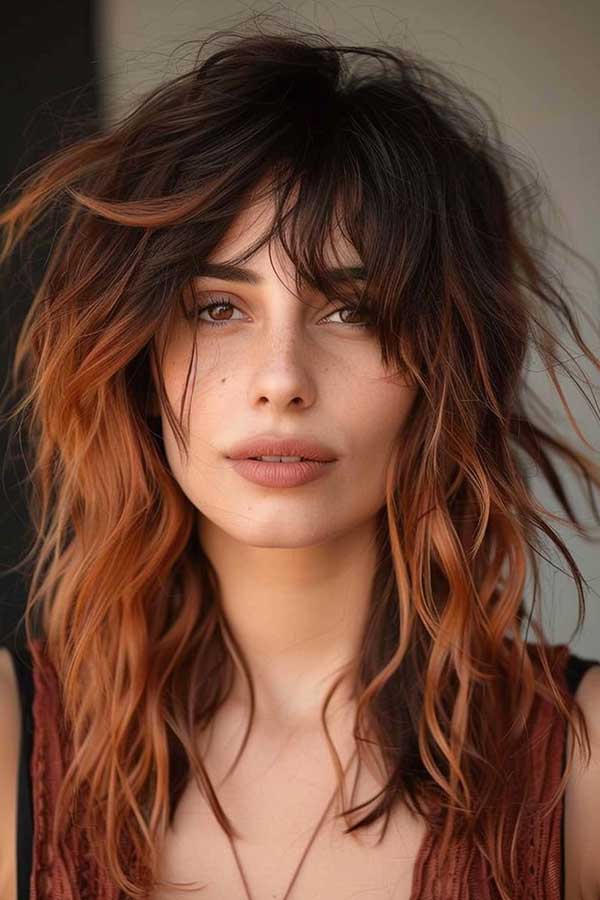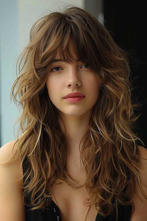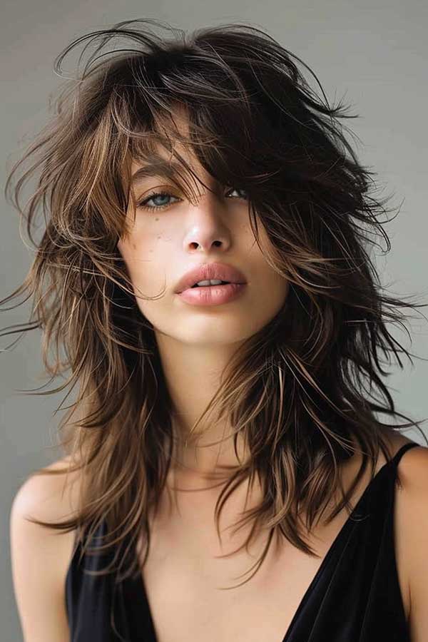 The tousled fringe shag is a trendy, relaxed haircut with choppy, textured layers and a slightly messy fringe that gently frames the face. Its long, feathered layers boost volume and flow, suiting all hair types. This low-maintenance style works well for straight, wavy, or curly hair, offering a laid-back yet edgy look.