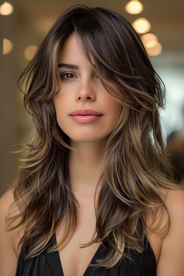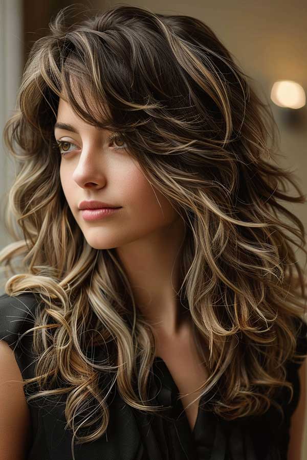 Long layered shag with highlights is a vibrant, dynamic haircut featuring cascading layers that boost volume and texture. Highlights, whether subtle balayage or bold streaks, add dimension, catching light to enhance the shag’s tousled charm. Suited for all hair types, it’s low-maintenance and versatile. Style with texturizing spray for a carefree vibe or blow-dry for sleekness.