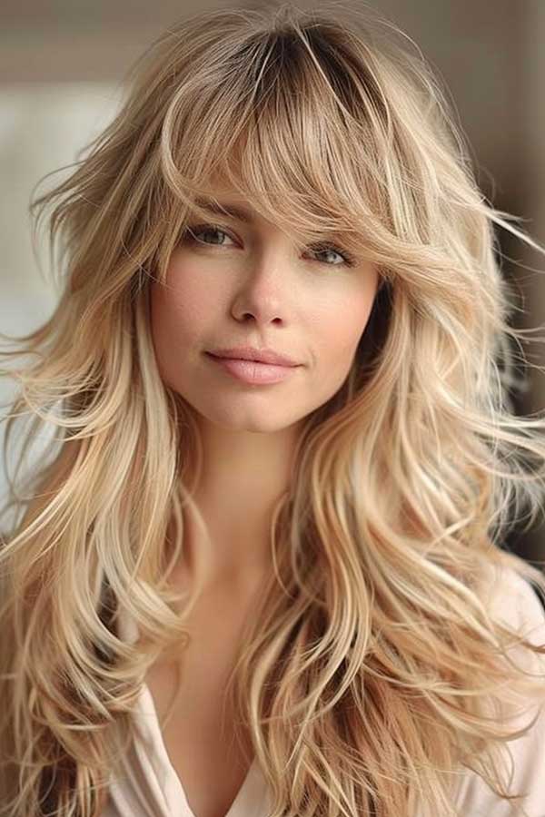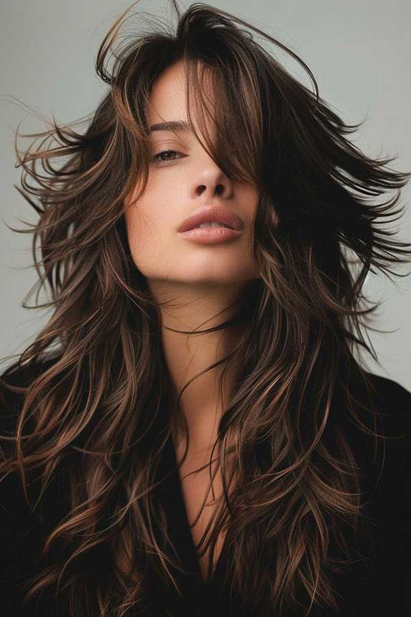 Long shag haircuts have surged in popularity for their effortlessly cool, versatile vibe. Characterized by choppy layers, textured ends, and a slightly tousled look, this style adds volume and movement to long hair. The modern long shag draws inspiration from the ’70s rock era, blending retro flair with contemporary finesse. It works well across hair types including straight, wavy, or curly hair, enhancing natural texture while keeping maintenance low. The cut typically features shorter layers around the crown and face, gradually lengthening toward the bottom, creating a soft, feathered silhouette. Bangs, whether curtain or wispy, often complement the style, framing the face and adding a playful touch. Ideal for those seeking a bold yet low-effort look, the long shag suits various face shapes, with layers customizable to highlight features like cheekbones or jawlines.