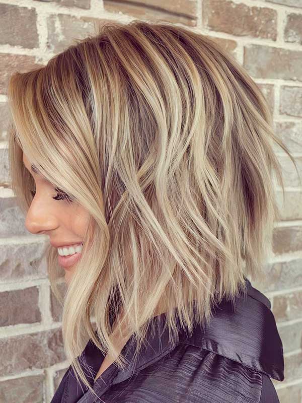 The lob sits just above the shoulders while textured layers add volume and movement. Side-swept bangs frame the face beautifully while giving the style a polished and effortless feel. This cut is easy to maintain and style while making it a perfect everyday look with a touch of modern elegance.
