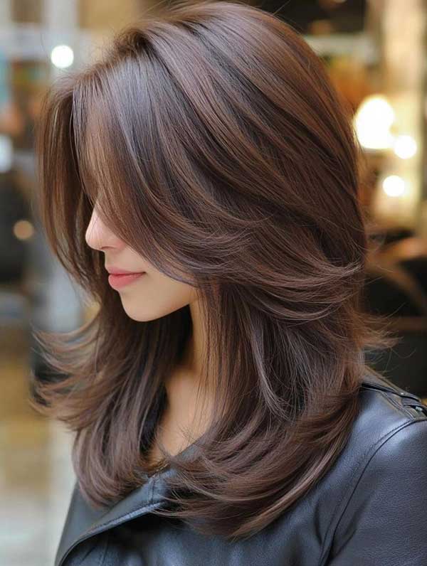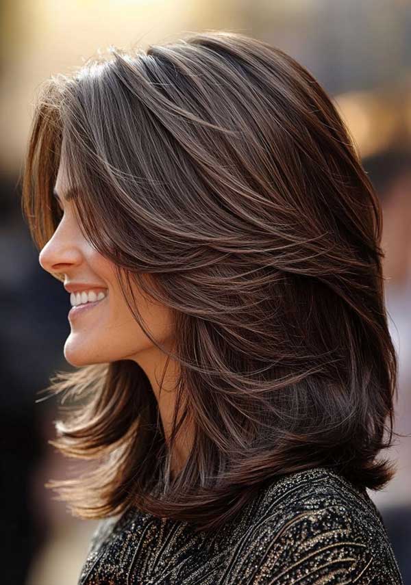 The medium feathered layered haircut is a timeless style that adds softness, movement, and volume to the hair. Feathered layers are finely tapered while creating a light and airy effect that flatters most face shapes. This cut works beautifully with straight or wavy textures which offers a natural flow and bounce.