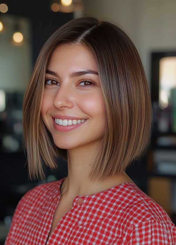 The medium blunt bob haircut is a sleek style known for its clean, even ends and sharp silhouette. This cut adds the illusion of thickness while making it ideal for fine hair. The blunt bob is a chic, minimalistic vibe that’s easy to maintain and perfect for a everyday look.