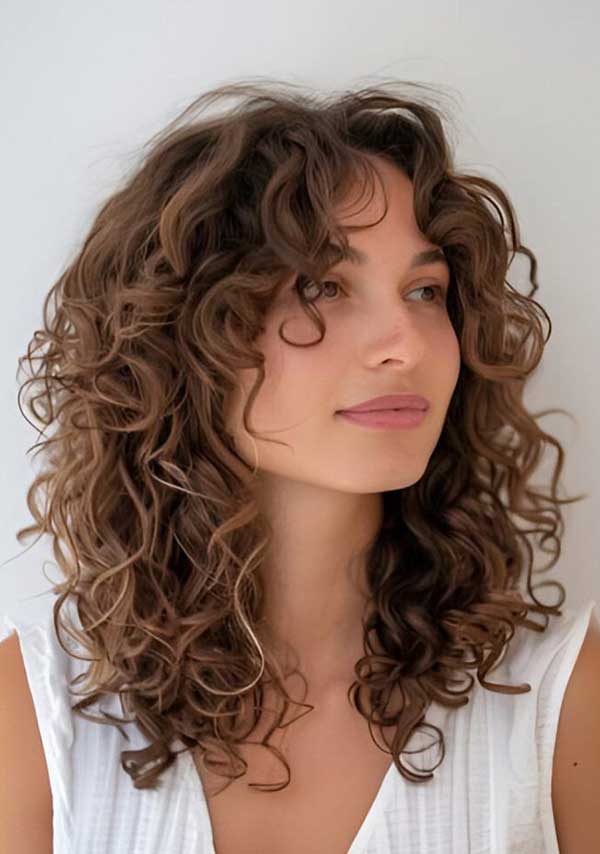 The medium curly shag is a textured haircut that highlights natural curls and adds effortless volume. It creates shape and definition while keeping the hair light and bouncy. This style delivers a relaxed, retro-inspired look that suits a variety of face shapes.