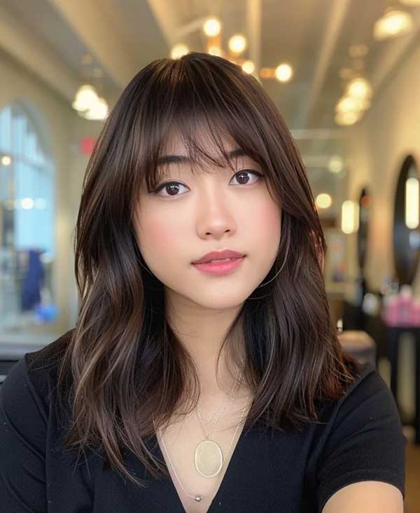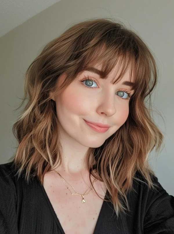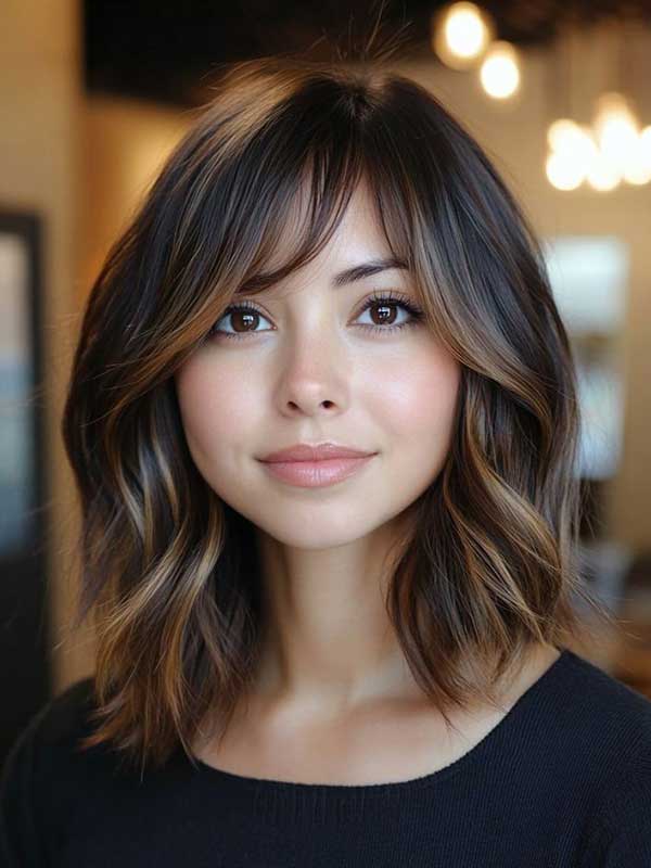 Medium haircuts are also low-maintenance and requires less frequent trims than shorter styles while still being easier to manage than long hair. They can be easily customized with bangs whether curtain, side-swept, or blunt to soften the face or highlight features. This length works well with color treatments like balayage or highlights, allowing dimension to shine through.
