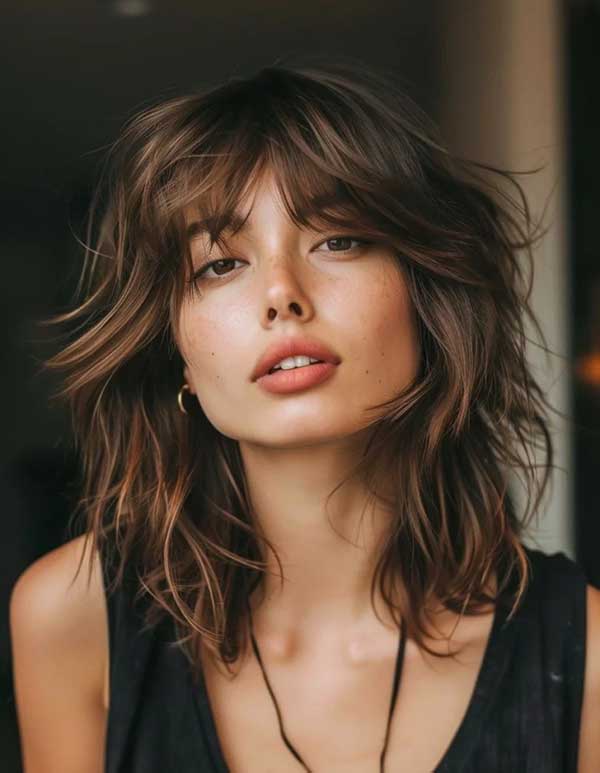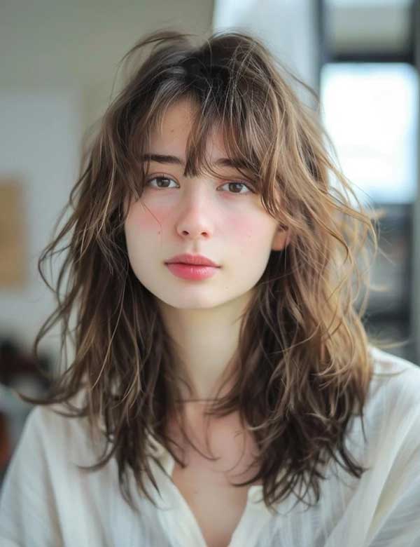 The tousled medium shag with curtain bangs is a low-effort haircut packed with texture and personality. Choppy layers create natural volume and movement while curtain bangs gently frame the face which adds a retro-chic touch. This cut works especially well with wavy or slightly messy hair.