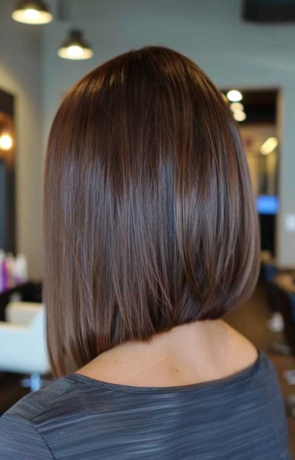 The sleek angled lob is a modern haircut that combines clean lines with a polished finish. Longer in the front and slightly shorter in the back, it creates a flattering face-framing shape that adds structure and sophistication. This style works best with straight or smooth hair to highlight its sharp angles.