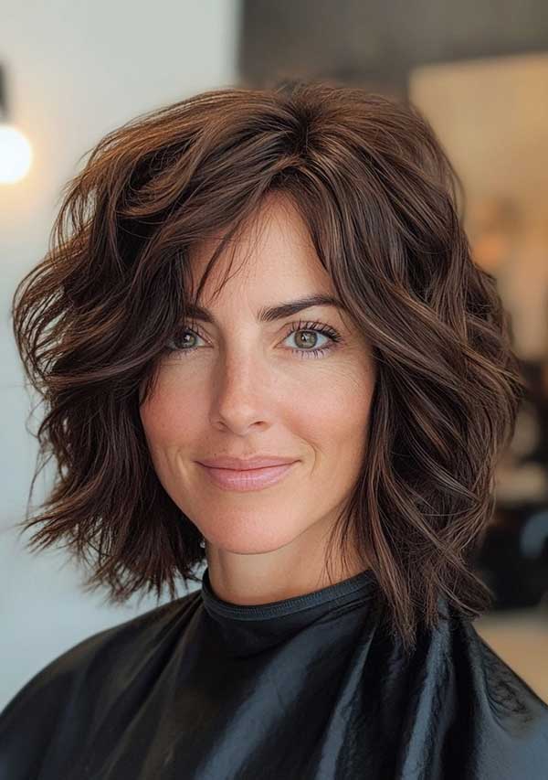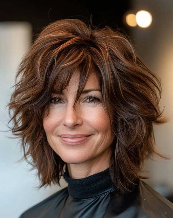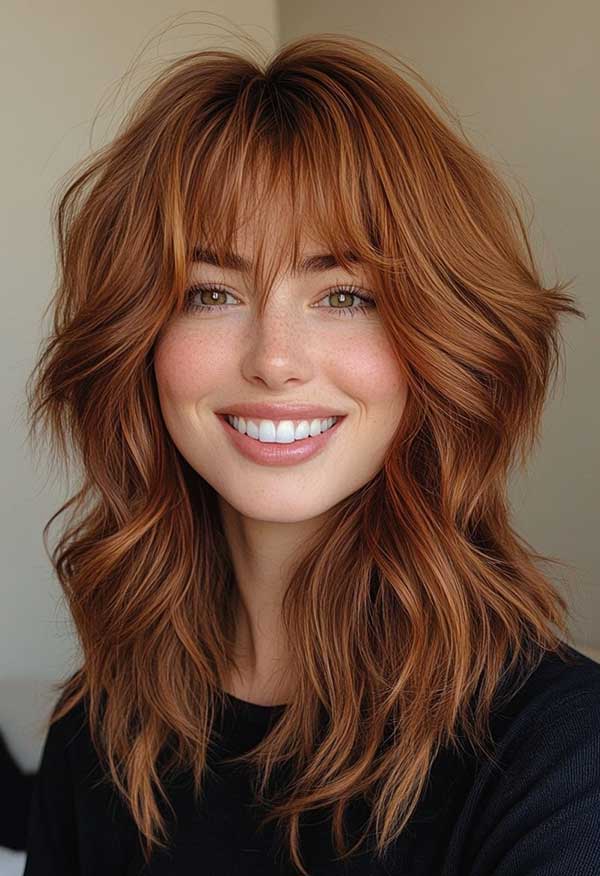 The wavy shag haircut adds effortless texture and volume to naturally wavy hair. This cut works well with medium to long hair and suits a variety of face shapes. Add curtain or wispy bangs for extra movement and charm while making it a go-to style for a modern vibe.