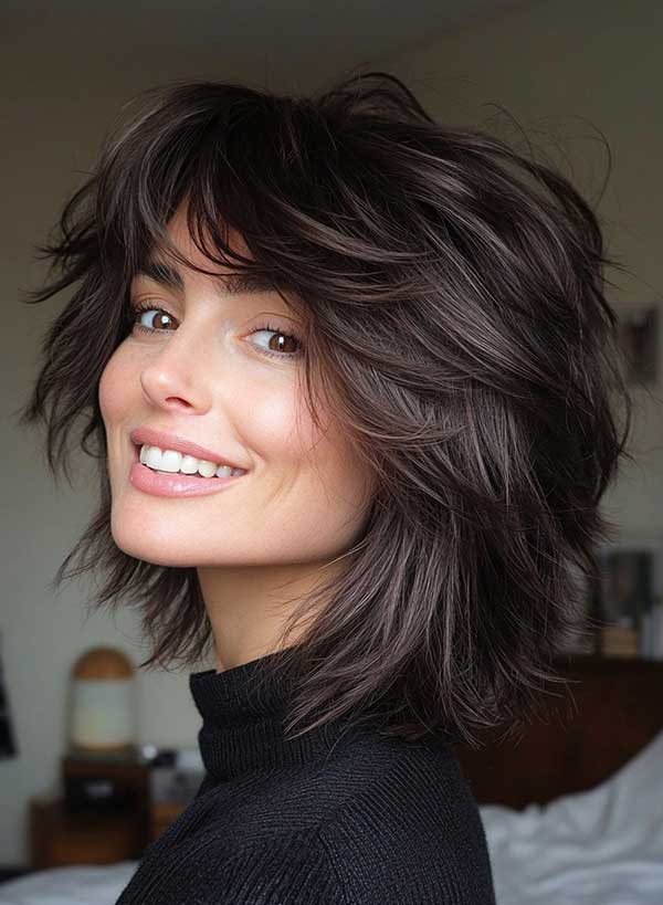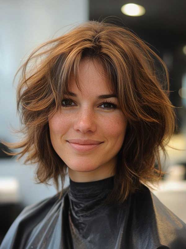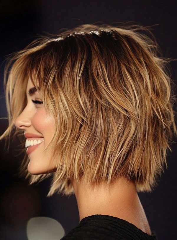 This cut adds volume and a lived-in, tousled feel with textured layers and uneven, jagged ends. It’s ideal for creating movement and edge, especially on straight or wavy hair. This style gives a carefree vibe that’s perfect for anyone wanting a short haircut with bold personality and relaxed texture.