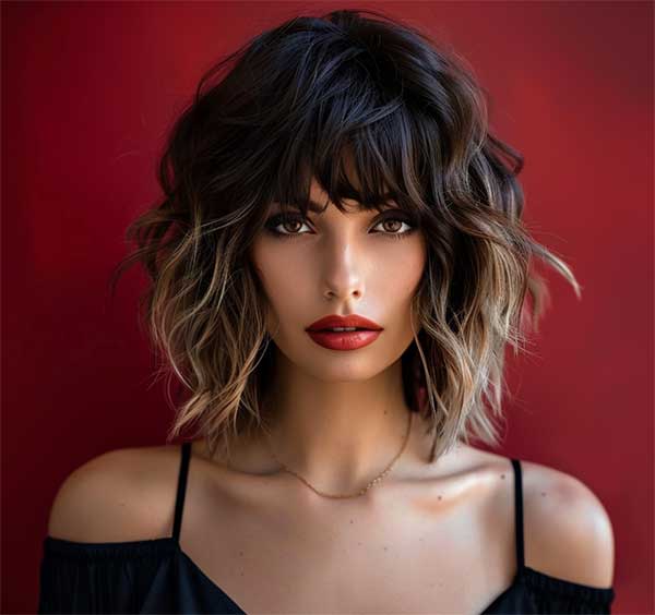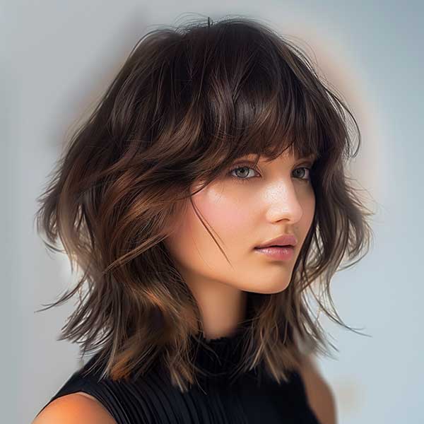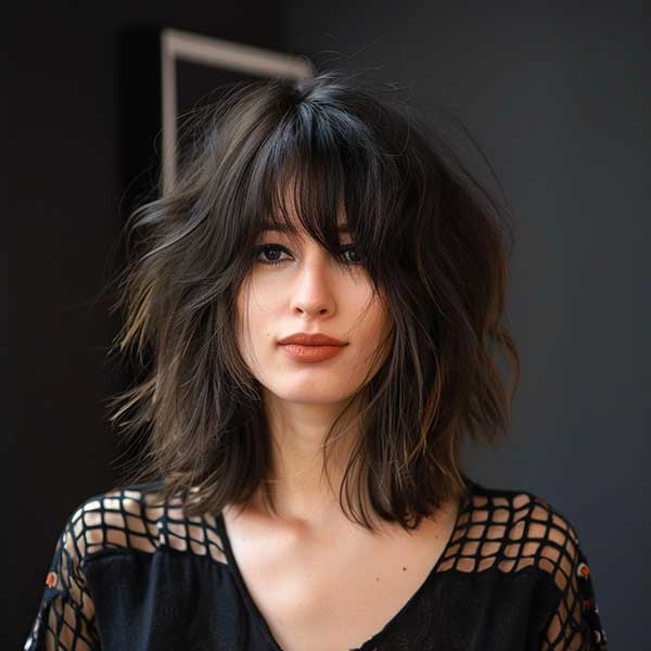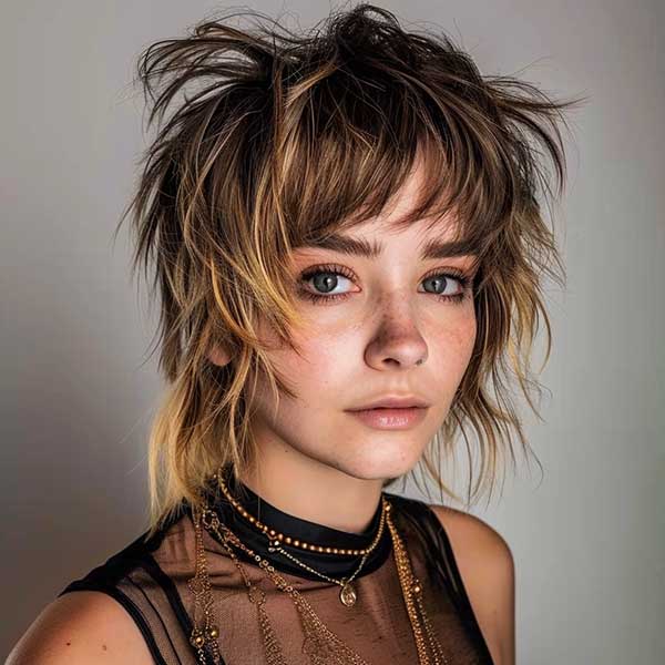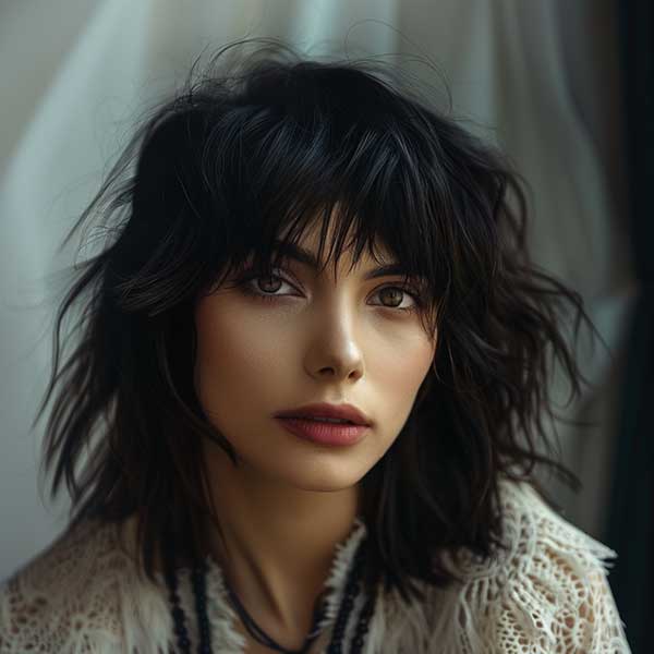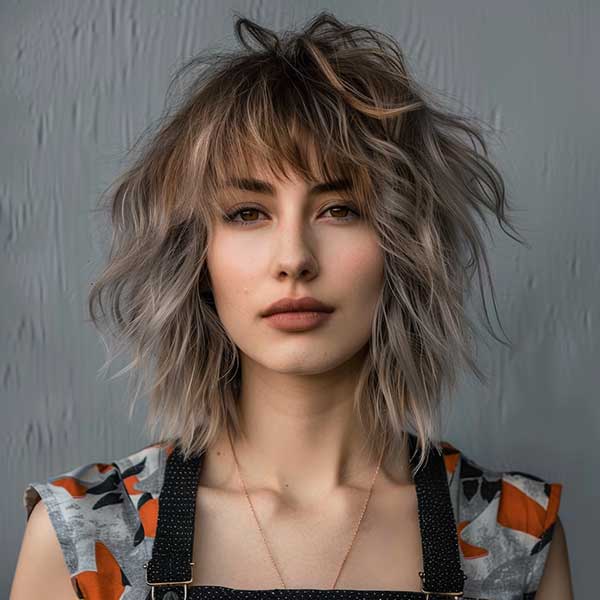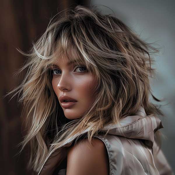 Shaggy wolf with bangs combines the messy textured layers of a shaggy cut with the bold edgy shape of a wolf cut. Adding bangs whether wispy or blunt, frames the face and softens the wild look, creating a balanced trendy style. This haircut offers effortless volume and movement, perfect for those who want a rebellious yet approachable vibe.