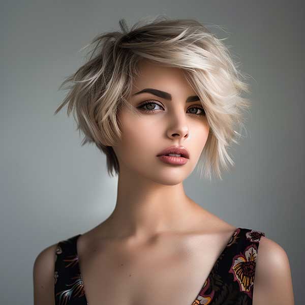 Short blonde wolf cut is a textured hairstyle with layered choppy ends and vibrant blonde tones. The blonde color adds brightness and depth, highlighting the wild layers. Ideal for anyone seeking a trendy, easy-to-maintain look, this cut combines edgy punk flair with a fresh, lively feel.